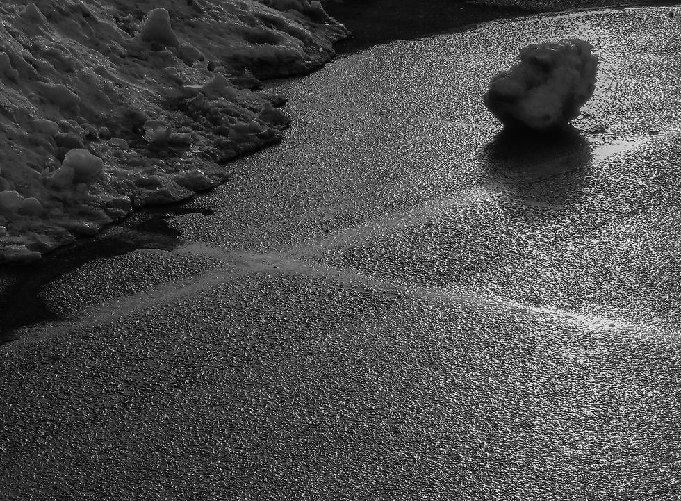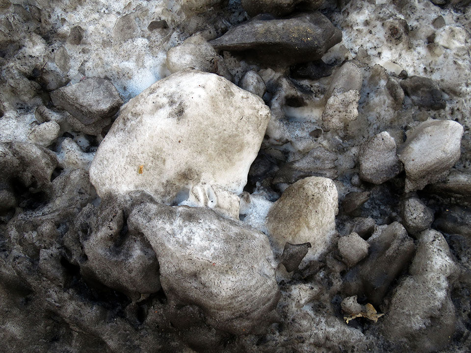 Given the extensive footprint of some of these lots, the plowed snow piles can be large enough to dwarf most vehicles. The piles often melt quickly in Colorado, whereas they can last for months in northern states. Either way, they conform to natural erosion, expansion, contraction, melting, and refreezing processes as pristine snow falls, oily sludge is splashed, and garbage is accreted.